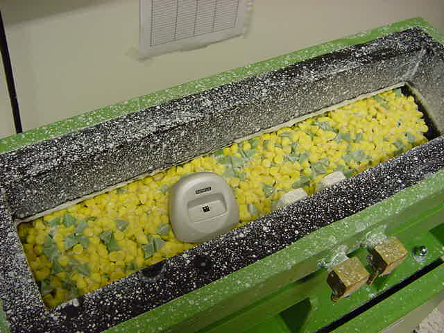 1、測試機器的槽中要裝滿磨損顆粒,顆粒要混合3份的 RKF 10K(黃色圓錐體)和1份的 RKK 15P(綠色的金字塔體),總共約15升。注意,新的磨損顆粒在使用前,需要在機器上泡至少2升的水中運行 6小時以上,并且運行過程中每半個小時添加0.5升的水。